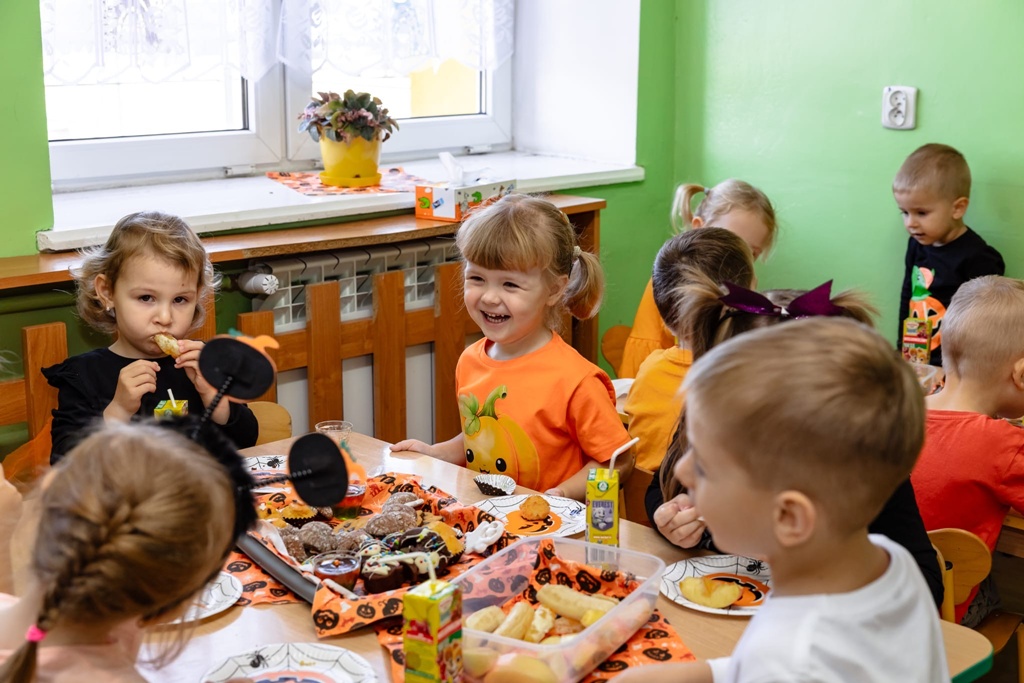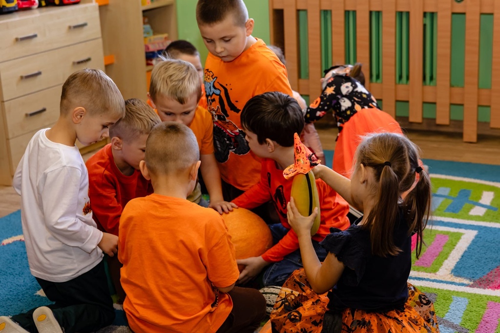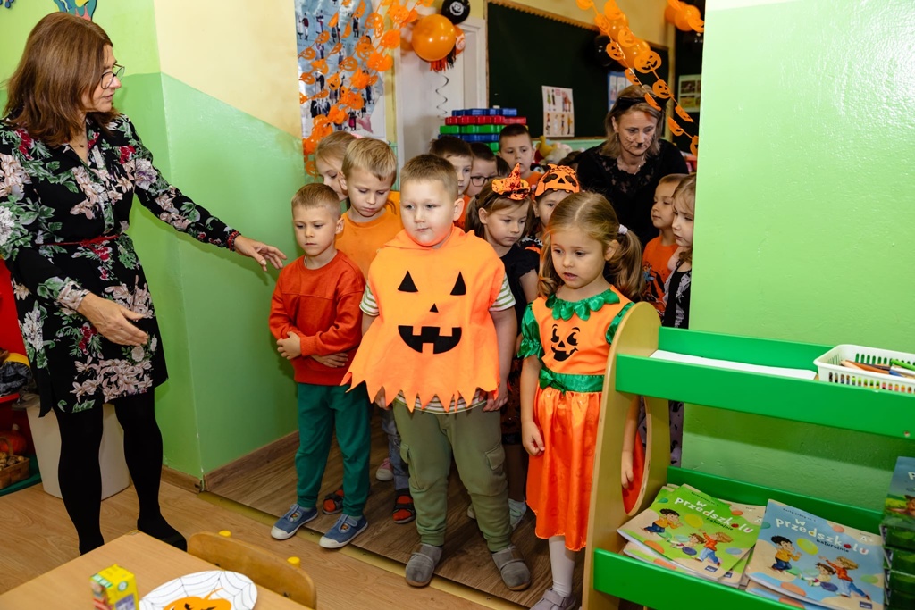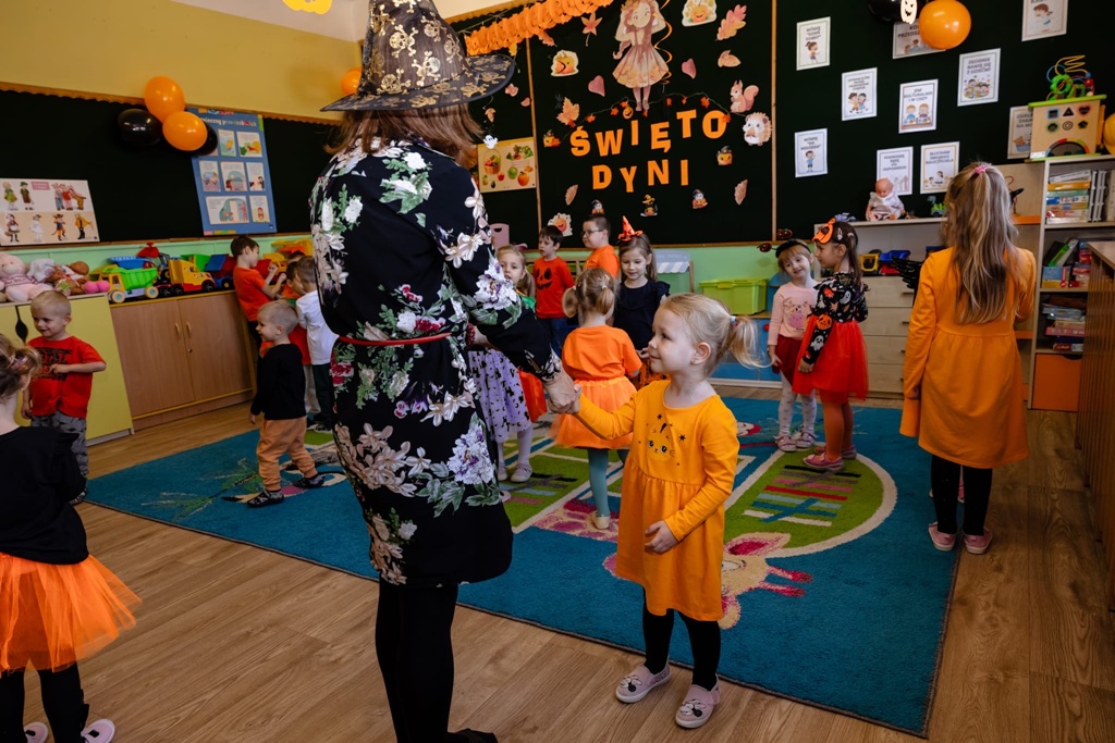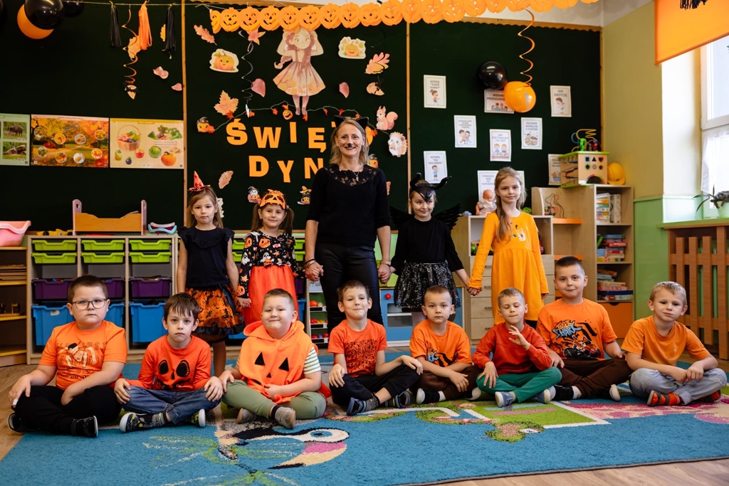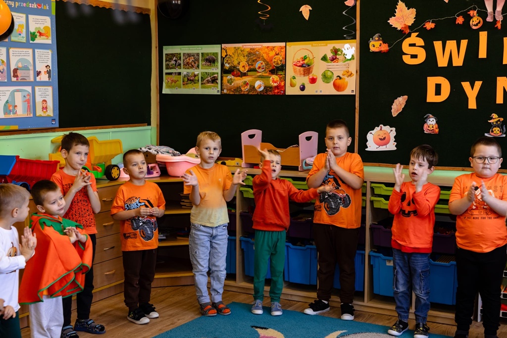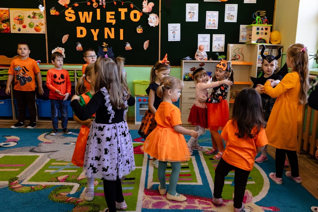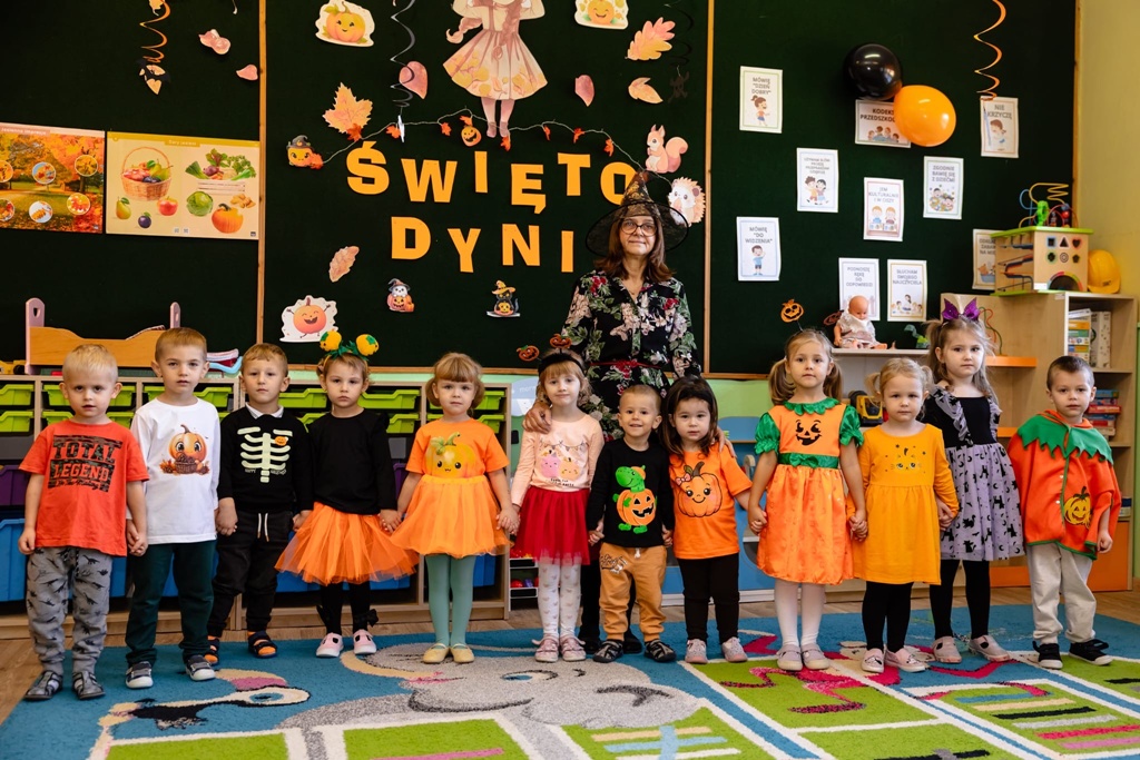 31 października obchodziliśmy w naszym przedszkolu Święto Dyni. Był to dzień pełen radości, uśmiechu, kolorów i jesiennej atmosfery. Dzieci ubrane w pomarańczowe stroje zapoznawały się z ogromną rodziną dyni, poznawały jej wartości odżywcze, rozwijały kreatywność i umiejętności manualne. Wszystko to odbywało się w pięknie przystrojonej sali, wśród różnych gatunków tego warzywa. Tańce i zabawy przy muzyce o tematyce jesiennej sprawiały przedszkolakom dużo radości. Podobnie spożywanie dyniowych smakołyków podczas wspólnego poczęstunku. Kolorowe prace wykonywane różną techniką stały się ozdobą przedszkola. Serdeczne podziękowania składamy Rodzicom. Za przygotowanie kolorowych strojów oraz wystroju sali i korytarza. Dziękujemy!