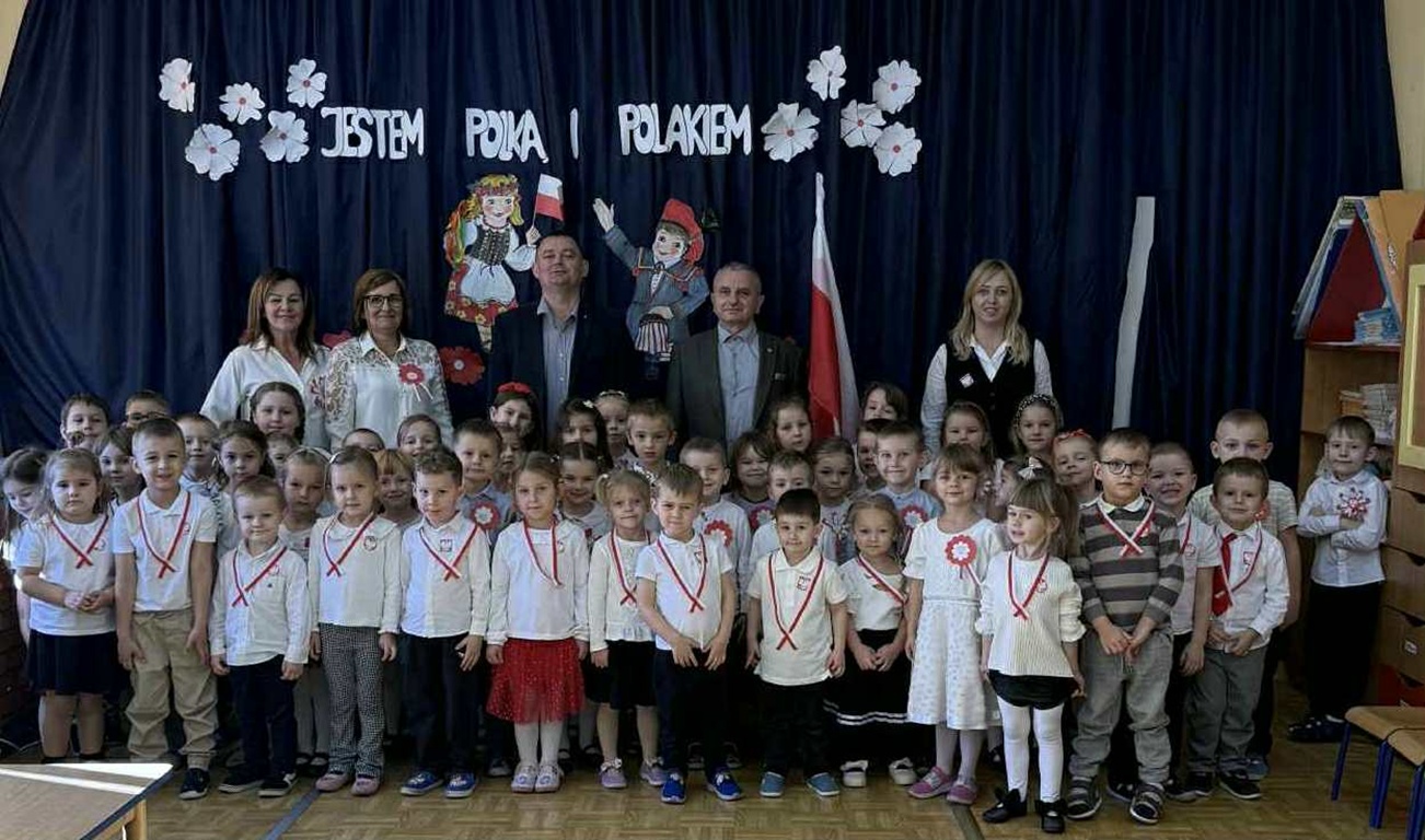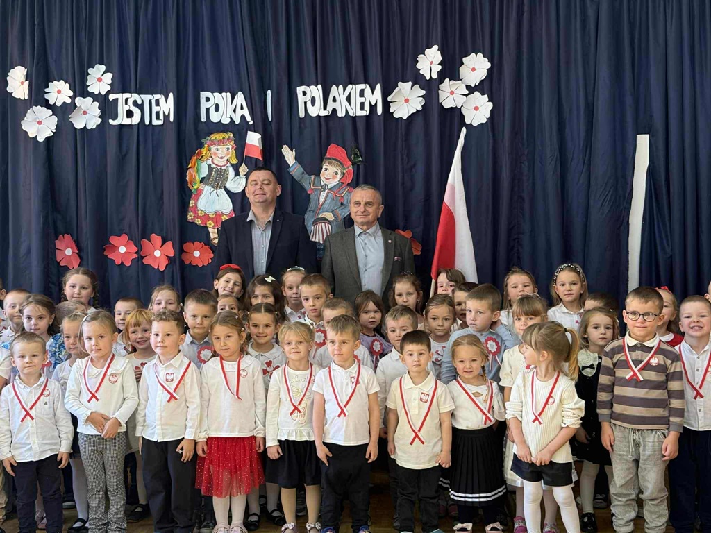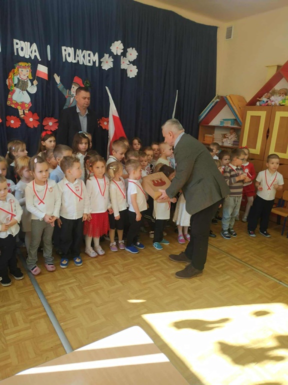 W tym dniu odwiedzili nas w przedszkolu zacni goście: Wójt Gminy Nowej Brzeźnicy – P. Tomasz Dygaś oraz Sekretarz Gminy – P. Jarosław Wojtczak. Dokładnie o symbolicznej godzinie – 11:11 wszystkie przedszkolaki, pracownicy przedszkola oraz przedstawiciele gminy uroczyście zaśpiewali hymn narodowy – „Mazurka Dąbrowskiego”.