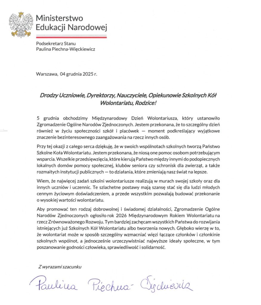List Pani Ministry, Pauliny Piechny-Więckiewicz w sprawie Szkolnych Kół Wolontariatu i wspierania działań uczniów w ramach wolontariatu w szkołach i placówkach.